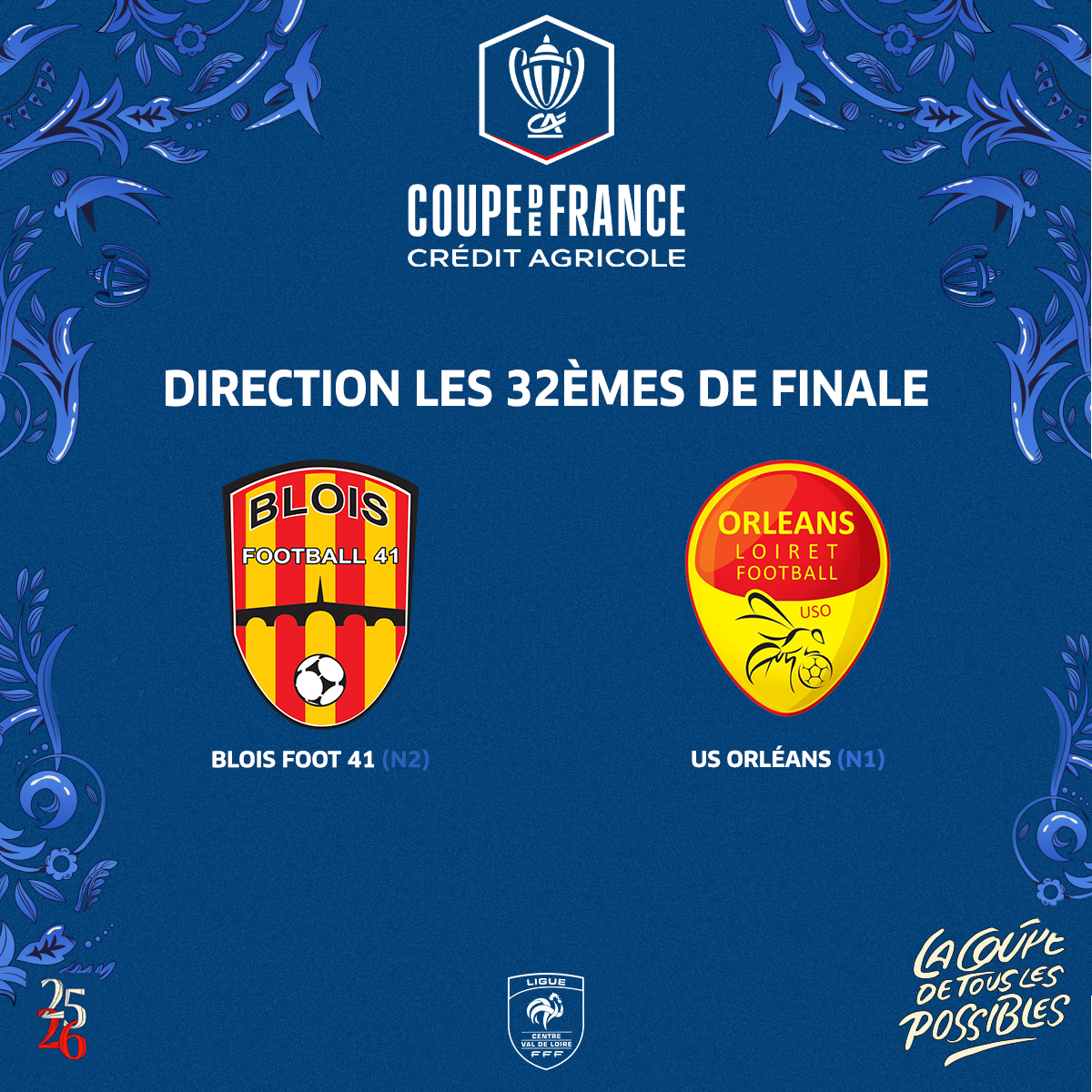 Le Blois Foot 41 et l’US Orléans Loiret Football seront au rendez-vous des 32èmes de finale de la Coupe de France Crédit Agricole pour cette édition 2025/2026.