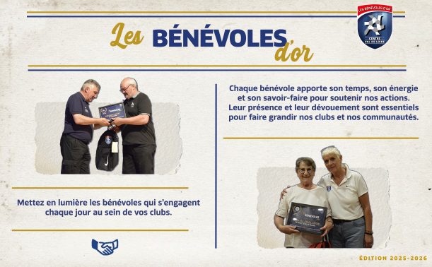 Pour la 5ème saison consécutive, l’opération des bénévoles d’or revient en 2025/2026 afin de valoriser et récompenser les bénévoles qui œuvrent au quotidien dans vos clubs.