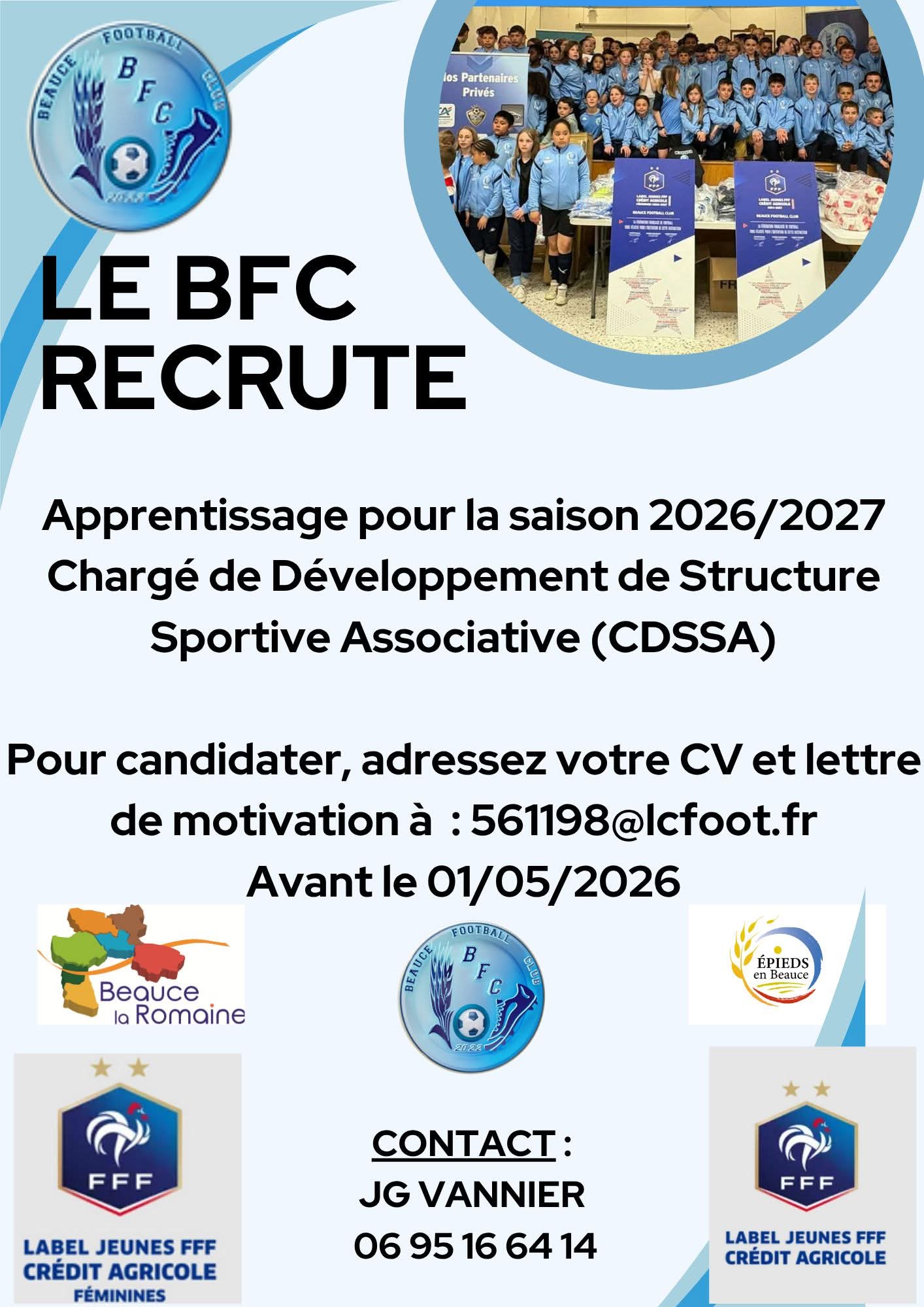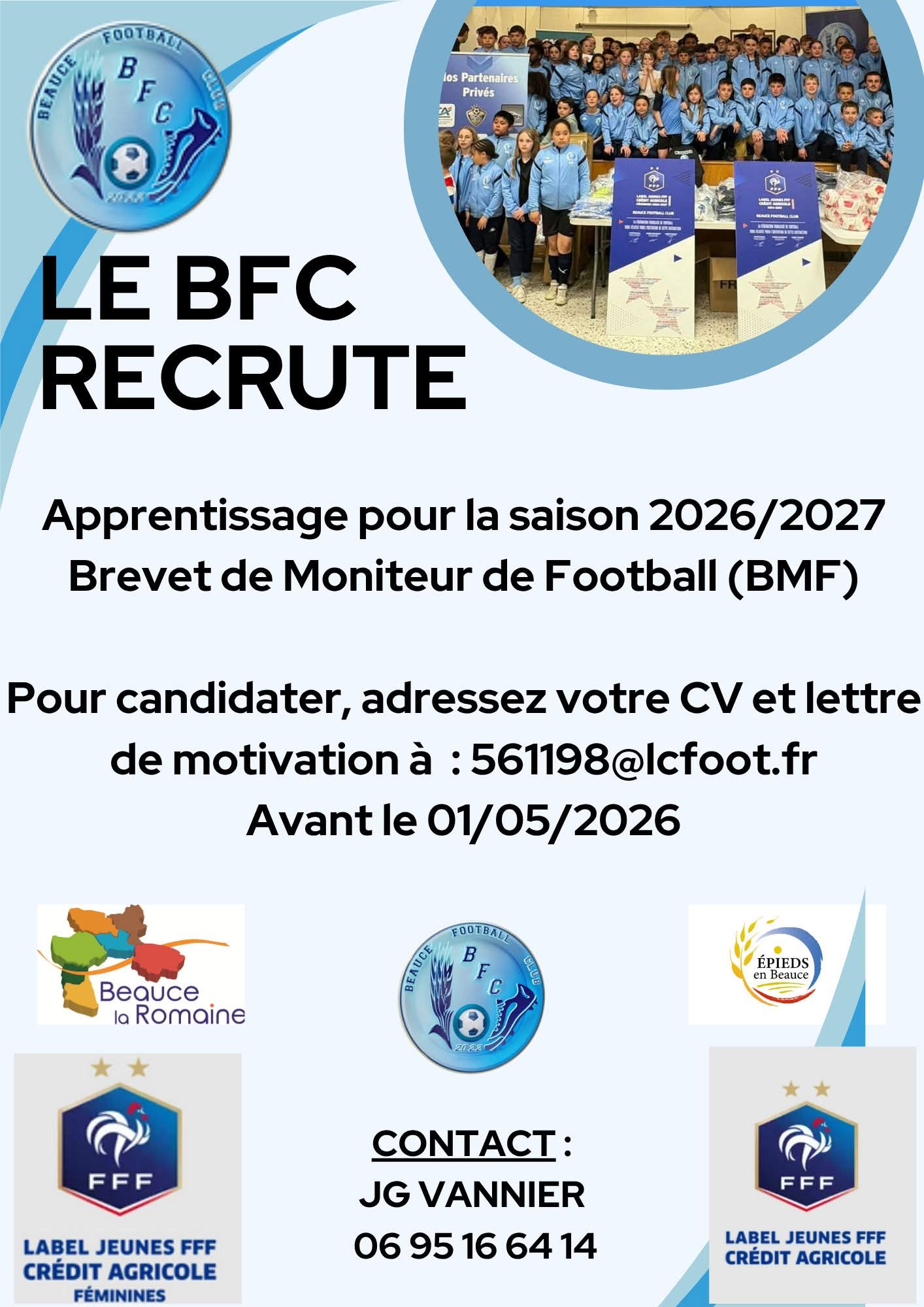 Le club de Beauce FC recrute pour saison 2026 -2027 : BMF et CDSSA en apprentissage.