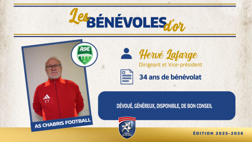 Pour la saison 2025-2026, découvrez le nouveau bénévole d’or : Hervé Lafarge, bénévole depuis 1992 au club de l’AS Chabris Football.
