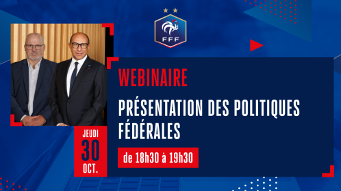 La Fédération Française de Football vous propose de participer à un webinaire vous présentant les Politiques Fédérales en présence de Monsieur Philippe Diallo et Monsieur Claude Delforge le jeudi 30 octobre 2025 de 18h30 à 19h30.