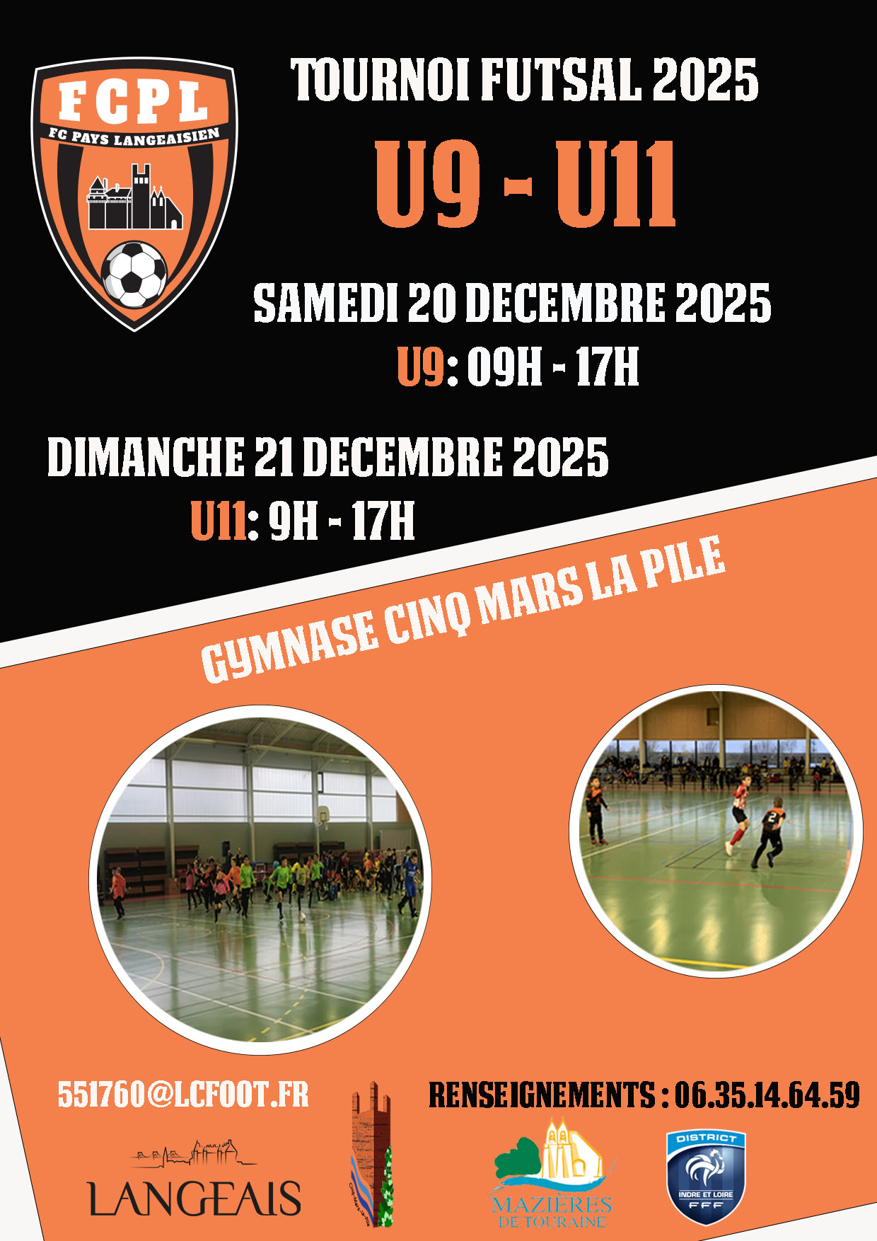 Le FC Pays Langeaisien organise un tournoi Futsal U9/U11 le samedi 20 et dimanche 21 décembre 2025. Découvrez l’affiche de ce tournoi.