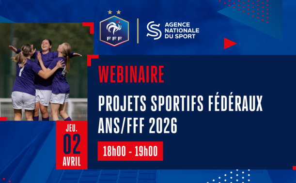 La Fédération Française de Football vous propose de participer à un webinaire « projets sportifs fédéraux », campagne ANS et FFF 2026 le jeudi 2 avril 2026 de 18h à 19h.