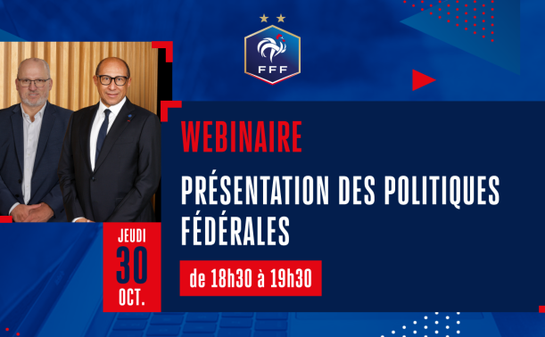 La Fédération Française de Football vous propose de participer à un webinaire vous présentant les Politiques Fédérales en présence de Monsieur Philippe Diallo et Monsieur Claude Delforge le jeudi 30 octobre 2025 de 18h30 à 19h30.